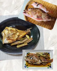 カサゴの煮付け カサゴを頂いたので煮付けにしました☺️大きい方は鍋で場所を取るので頭は落としました(頭デカい🤣) ごぼうも一緒に入れたらこちらも美味しかった〜