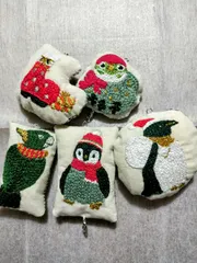 鳥🐦️の刺しゅう 木の枝に下げました ■作品内容鳥🐦️の刺繍をしたものをオーナメントにして白く塗った枝に下げました。■工夫ポイントクリスマス仕様なので緑、あか、金、銀色を使って刺繍しました。