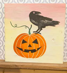 ミニサインボード【カボチャに乗ったカラス】Crow on Pumpkin 急にB&Bがやりたくなり😆作ってきました😊💕B&Bはやったことありますが、実はミニサインボードは初めて😅🔰 過去作 スモールボックス ポーチプランター シェルフスツールの3作品のみ😂まあ🤔シェルフスツールはミニサインボードと同じ過程だけど😁やっぱり時期的にハロウィン🎃サブタイトル【夕