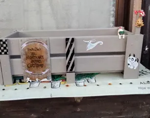 ボロボロ木製…BOXプランター大変身❗ こんな感じに変身しましたブラック塗装がハゲたり朽ちた木材でバラバラ寸前でしたが家にあった塗料ウッドグレイを厚めに塗装養生した木材の段差隠しで絵柄加えてみました明日息子家に届けて設置します✌️息子の好きなナイトメアプレート付けてあったのでキャラクターゼロとティム・バートンのフランケンウィニーキャラクタ
