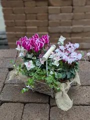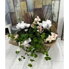 ガーデンシクラメンの寄せ植え GWSガーデンシクラメンの寄せ植え😊💕シクラメンは自分好みのピンク系🩷🤍の2色を選びました。カゴは思ったより、小さくここに5ポット(シクラメン×2·カルーナ·バコパ·初雪カズラ)入れるので土を割りばしでツンツンしながら必死に入れました😂持ったら、まあまあ重く良し良し😁🎶バコパは切り戻しすると、綺麗に