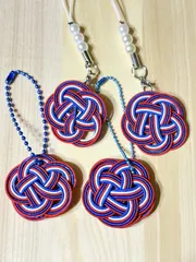 水引に魅せられて ■作品内容万博につけて行こうと水引の梅結びのキーホルダーと、バッグチャームを作りました。 ■こだわりポイントせっかくなので、ミャクミャクカラーの赤、青、白を入れて作りました。