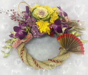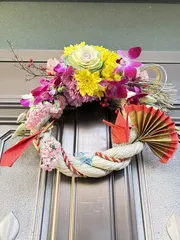 生花を使ったしめ縄アレンジ(午年なので水引の飾りも) ■作品内容特大のしめ縄にハボタンをメインにしてスプレー菊、デンファレ、スターチス、ナンテンを飾りました。他にも両面使いの和紙を使って扇子や鶴を折り、飾りました。今年は午年なので、水引で馬を作りしめ縄に付けました。■工夫ポイント生花はそのままでは、しめ縄に付けられないので予めオアシスの土台を取り付けま