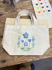 アデリアレトロなトートバッグ(花レース) ■作品内容アデリアレトロなトートバッグを作りました。見本は赤い花でしたが、私の大好きなブルーの花にしました。葉っぱや茎の部分はグリーンで。■こだわりポイント布絵の具でステンシルをする時は、とにかく絵の具をつけ過ぎない事。薄く薄くトントンと。を意識してステンシルしました。これで、裏に絵の具がうつること