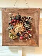 木の実のフレームアレンジメント 沢山の種類の木の実を使ってフレームアレンジメントを作りました。他の所でのワークショップですが、初めにメインの木の実を選び他はその高さに揃えてアレンジしていきました。玄関が秋らしくなりました。