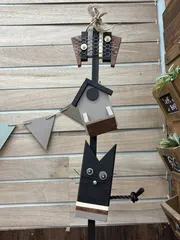 ハロウィンサインポール ストアオリジナルのハロウィンサインポールを作りました。端材を利用してのハロウィンバージョン。パッチワークのかぼちゃや可愛いネコちゃんも付いて、楽しく作ることができました。参加したみんなの作品を並べて写真も撮りました。自宅に帰ってから、ハロウィン仕様のポーチプランターと一緒に飾りました。