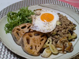 ガパオライス らでっしゅぼーやの食材で作りました🎶簡単でした🎶厚切りれんこんステーキが特に美味しかったです😋 mahalo♡
