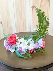 フラ合宿⑤レイメイキング✨ 2日目の始まりはご来光🌄から始まりレイメイキングのWS🎶でも花が少ないのでできたのはヘアクリップ😆カーネーション🩷🧡と白い菊🤍おまけにこんなに綺麗な八重の百合🩷素敵〜😍まずお花を短く切って庭のリーフを分けます🌿軸になる葉っぱは先生が持って来るのを忘れたのでビニール紐で代用😅3本をくくって少し三つ編み
