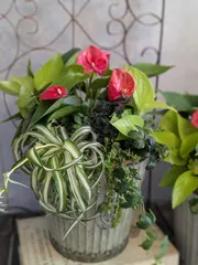 観葉植物の寄せ植え🌿 ■作品内容観葉植物の寄せ植えは初めてでしたが素敵な寄せ植えができて満足です🤗クリスマスの飾り付けをしました🎄🎅 ■工夫ポイント水はやりすぎず鉢が軽くなったら水をあげます。 mahalo♡