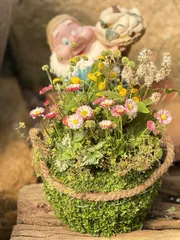 球根を使ったブリコラージュ 球根を使ったブリコラージュフラワー教室に参加して来ました。ブリコラージュは初めてなので、やり方がよく分からず手取り足取り教えてもらいました。アネモネ、水仙、ムスカリ、原種のチューリップと、球根が沢山入ります。土の落とし方、水苔で束ねた花苗と球根を束ねて紐で巻きつけるなど丁寧に教えてもらいました。これ