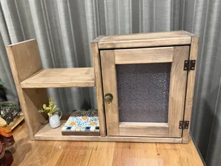 置く場所問題が解決しないのに形がかわいくてどうしても作りたくなり、昨日作ってきました。 木工DiyのWSとしては今年初でした。😊 色は安定のウォルナット扉をつけて閉めてみたら数ミリ当たってしまい調整に苦労しました。ありがとうございました🙏 似合いそうな取手を見つけたので