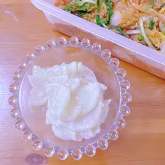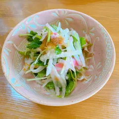■材料三つ葉・かまぼこ・なると・大根など梅干し(私は はちみつ梅を使用)亜麻仁油(サラダ油でも良い)■作り方①、三つ葉は3cmに切る②、かまぼこ・なると・大根はスライサーで千切り③、梅干しは たたき梅にする④、①②③を混ぜ合わせる⑤、盛ってから亜麻仁油をかける■工夫ポイントかまぼこ・なると・大根をス