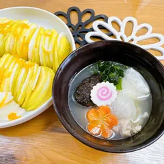 お雑煮 フツーだけど、我が家のお雑煮😅横のは『大根とりんごの甘酢漬け』漬け過ぎて、りんご感がなかった😅