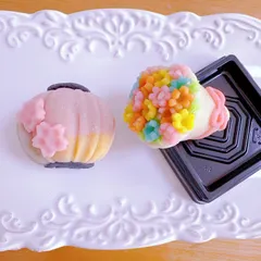 先生にリクエストしていた『毛糸玉🧶』デザインの練り切りだったので、レッスンを休む事も出来ず、先生に事情を話し、途中からの参加。無理したけど、頑張って受講して良かったです✨毛糸玉に刺さっている編み棒はパスタを揚げたもの、丸の部分は練り切りです🧶白い練り切りは、毛糸の帽子です🤭ハート型は、ケースに入りき