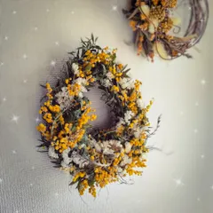ナチュラルキッチンでのWSで作りました💛見本とキットはコチラ⬆️のように、ピンク系の小花が付いてるのですが、追加で別の黄色いお花を購入して、アレンジしました😌コチラがキットの内容ミモザだけでリースにした後、空いてる場所にピンク系小花を入れていく手順だったので、そうとは知らずに大きいお花を選んでしまっ