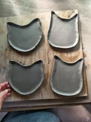 猫皿?犬皿? 実は作陶は今日が今年初。ニャンコ2種類、のつもりが、右側はワンコに見える…(;゜O゜)絵付けor施釉でニャンコに生まれ変わらせるか…?!因みに、こちら、例の鬼のお面を使用したものです👹😺今日の作陶成果はこの4枚と器2つ。ポカポカ陽気でサクサク進みました~☀😃
