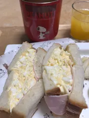 たまごサンド🥪🥚 今日の朝ごはん🍞 今朝は5時に旦那が仕事に出て行ったあと、ゆっくり時間があったので卵茹でてサンドイッチ🥪作りました😊(前回は厚焼き玉子でサンドイッチ🥪でした) チーズ🧀とハム🐹も入れて盛りだくさん😆 食べてるとヨコから零れまくりでしたが美味しかった😋