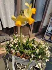 ヒナソウが咲き終わる😣と思っていたら、長持ちするヒナソウです芽出し球根がスクスク成長してきて、水仙が咲きました👏ヒヤシンスとムスカリも出てきたので、もう少しで花ざかり🥰