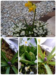 芽出し球根の寄せ植え、その後 ヒナソウが咲き終わる😣と思っていたら、長持ちするヒナソウです芽出し球根がスクスク成長してきて、水仙が咲きました👏ヒヤシンスとムスカリも出てきたので、もう少しで花ざかり🥰