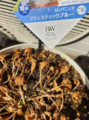 カンパニュラ カンパニュラ マジェスティックブルー 冬は地上部が枯れて暖かくなると~と書いてあって大丈夫かなぁと思っていたらちゃんと出てきました😊枯葉をお掃除してあげたらたくさん芽が🎶