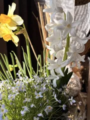 帰宅したら部屋がヒヤシンス🪻の香りがしてスイセンも咲いています♪ワークショップから1週間🎶楽しみたいからと小さいものを選んだけど暖かいからなのかなスイセンは白を選んだけど黄色が咲いてるような🤣