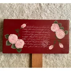 ガーデンピック♪ 端材でガーデンピックを作りました♪ アクリル絵の具で下地を塗り、真ん中にスタンプをトールペイントでバラの花を描きました🎨 ピックの柄は少し短めなので、鉢やプランターに刺して楽しんでいます♪♪