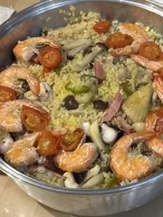 お正月で余ったエビとタコとお刺身で簡単なパエリア作りました。味付けはシーズニングスパイスでお手軽〜🐙無水鍋だと強火で沸騰させて弱火で15分、蒸らしに10分。お正月にスペイン料理❣️