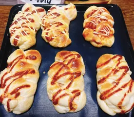 本日は、ウィンナーパン作ってます🙌🏻 思ったよりも成形が難しかったです😓 包んだ時は大丈夫と思ったら2次発酵で、形が歪んじゃいました💦 もうちょっと簡単にすれば良かった😭 しかもケチャップ盛大に出しちゃって、一つはケチャップまみれ😱 誤魔化しで、マヨネーズかけてみましたが微妙ですよね😩 焼