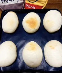 練乳ミルクコッペ、焼き上がりました〜✨事前に生地作っておくと、朝焼きたてが食べれるのがいいですね🥰なるべく、焼き色がつかないように気をつけました🙌🏻しかし丸すぎてコッペに見えない😅次はもう少し細長くしないと🤔しっとりしてふわふわで美味しかったです❣️