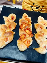 ウィンナーパン焼き上がりました🙌🏻手前は、まぁまぁ上手く焼けましたが奥のが特級呪物に😩成形をもう少し考えて作れば良かったなぁと後悔💦まぁ味に変わりはないので、美味しく食べます✨