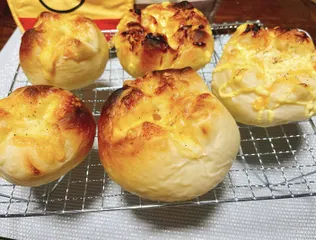 初、食パン以外を作ってみました🙌🏻ちょーっと焼きすぎましたが、チーズがいい感じにカリッとしたところと、とろ〜んとしたところがあって美味しかったです☺️こちらは焼く前です☺️プラスでマヨネーズと黒胡椒かけたりもしてみました✨不恰好ですが、中はもちもちっとしててまぁまぁ上手く出来てよかったです❣️形も綺