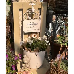 こちらは、ブリキのポットに、麻布を敷き、イベリスと一緒に植え込みました🎵白が可愛いです😍