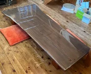 これ、ウチで20年使ってる座卓です⬇️1枚板に見えるけど真ん中で上手く継いである。お気に入りなんだけど、使用20年も経つとさすがにキズだらけ(主に猫による)、あちこちにシミも付いてる(主に人間による)。なんとかしたいってずっと思ってたんだけど、1日で仕上げないと、夕飯の時お皿を床に置いて食べるしかな