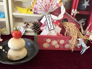 パンで鏡餅 ■作品内容パンで鏡餅■工夫ポイント焼いたパンが白く丸かったので、大きさの違う二つのパンを重ねて、上には、ミニトマト🍅を乗せて、鏡餅みたくしました
