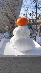 雪で作った鏡餅 大雪が降った翌日、雪かきをしたあとに、雪で鏡餅を作りました。雪かきが楽しくなりました。みかんはその後冷凍みかんにして美味しく頂きました。