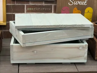 色は、以前作ったウッドコンテナと同じ超撥水ダスティグリーンにしました。ジグソーは線より内側に行ってしまい、綺麗な楕円にはならず鉄アレイ型に💦これはこれで可愛く見えてきました😁それより難しかったのはふるい!枠作りと金網に1番手こずって、結果1時間オーバーしてしまいました💦でも、めちゃくちゃ楽しかったで