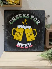 NEW ミニサインボード【ビールで乾杯🍻】 ミニサインボード男前シリーズの第2段は【ビールで乾杯🍻】😁💕海外のバル🍺をイメージして、はじめにめっちゃ⚒️叩きました😆🎶👍いつもは綺麗な木材を選びますが、今回は左右に大きな節のある木材を選択節を生かそうかと思いましたが、ベースの色が濃くて分からん🤣🤣 ロゴに使ったグリーン💚は枝豆🫛レッド