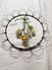 ワイヤーでフラワーフレーム 雑貨屋さんで開催されるワイヤーアートのWSでフラワーフレームを作りました。花びらが等間隔になるように一つ一つ図案の形に合わせてワイヤーを曲げて作って行きました。花びらも大きさが3種類あるので、5mmずつ大きを変えて作っていくのが時間がかかりました。出来上がりを見てみると、綺麗な曲線になってなかったり