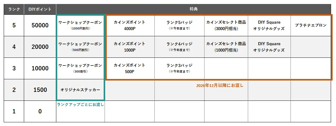 CAINZ DIY Squareでは、店舗ワークショップへの参加、コミュニティでの活動によりDIYポイントが貯まります。累計ポイントに応じてランクアップし、ランクに合わせた特典を受けることができます。